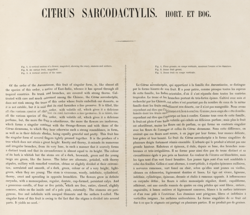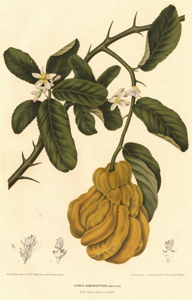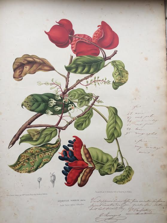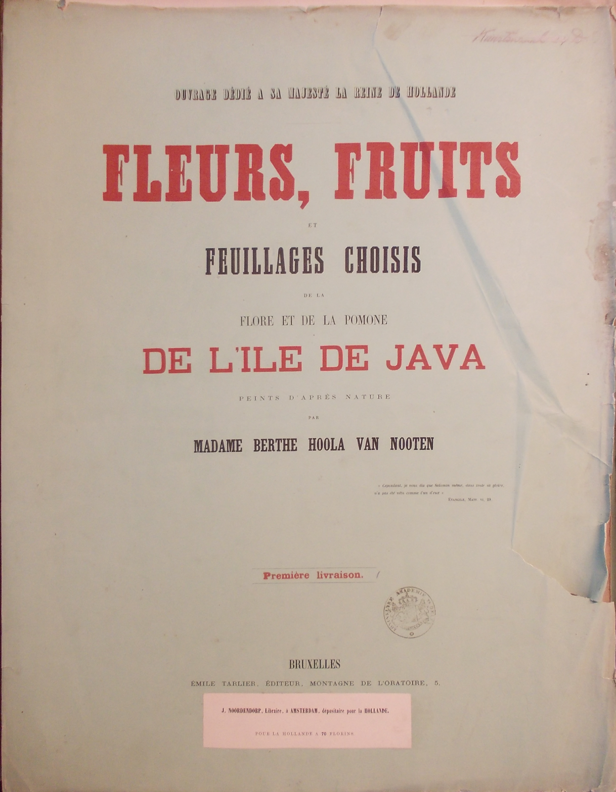 Hoola van Nooten, Berthe: Fleurs, fruits et feuillages choisis de la flore et de la pomone de l’Île de Java peints d’après de nature par madame Berthe Hoola van Nooten. Ouvrage dédié à sa majesté [sic] la reine de Hollande. Bruxelles: Émile Tarlier, Montagne de L’Oratoir, 5, 1863 [-’64] (2de editie Severeyns 1866, 3de editie Merzbach & Falk [1881]).