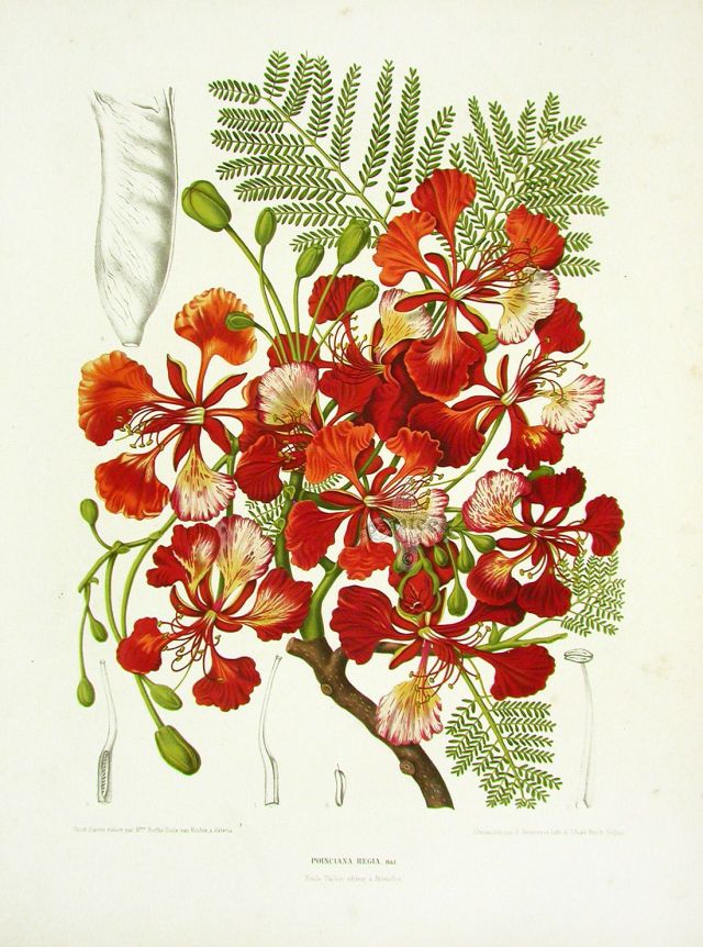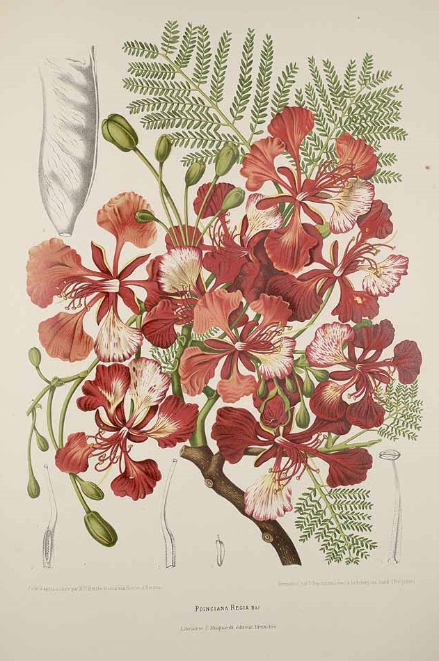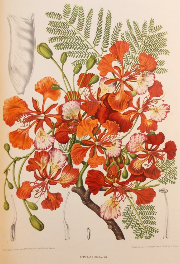afb. 6) Madame Berthe Hoola van Nooten: Fleurs, fruits [etc] de L’île de Java [etc], ongenummerde plaat ‘Poinciana Regia’ [= Delonix regia, vlamboom of pauwenbloem], chromolithografie.