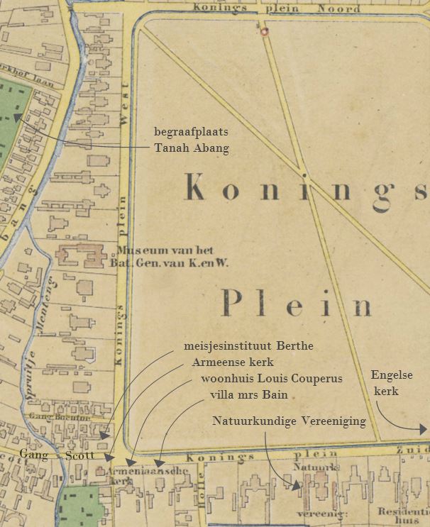 Iets verder naar het oosten, verscholen in het groen, op de hoek van de Gang Scott (tegenwoordig Jalan Budi Kemuliaan) en het reusachtige Koningsplein, staat de villa die ooit eigendom was van een zekere Robert Scott. Deze net als Berthes broer zeer succesvolle zakenman, volgens een nakomeling een achterneef van Sir Walter ‘Ivanhoe’ Scott, was onder meer werkzaam geweest als waarnemend havenmeester in Semarang voordat hij na het Engelse tussenbestuur op Java in 1820 in Batavia neerstreek. Aan de toen nog open vlakte ten zuiden van het Koningsplein (waarvan een gedeelte ook wel Buffelsveld, of liefdevol Buffeltje werd genoemd2) had hij zijn huis laten bouwen, in de eigenhandig aangelegde en naar hem vernoemde laan. Precies in dat monumentale hoekpand had de weduwe Van Nooten op 6 april 1857 een particuliere meisjesschool geopend.3 Het was de vierde in haar leven.