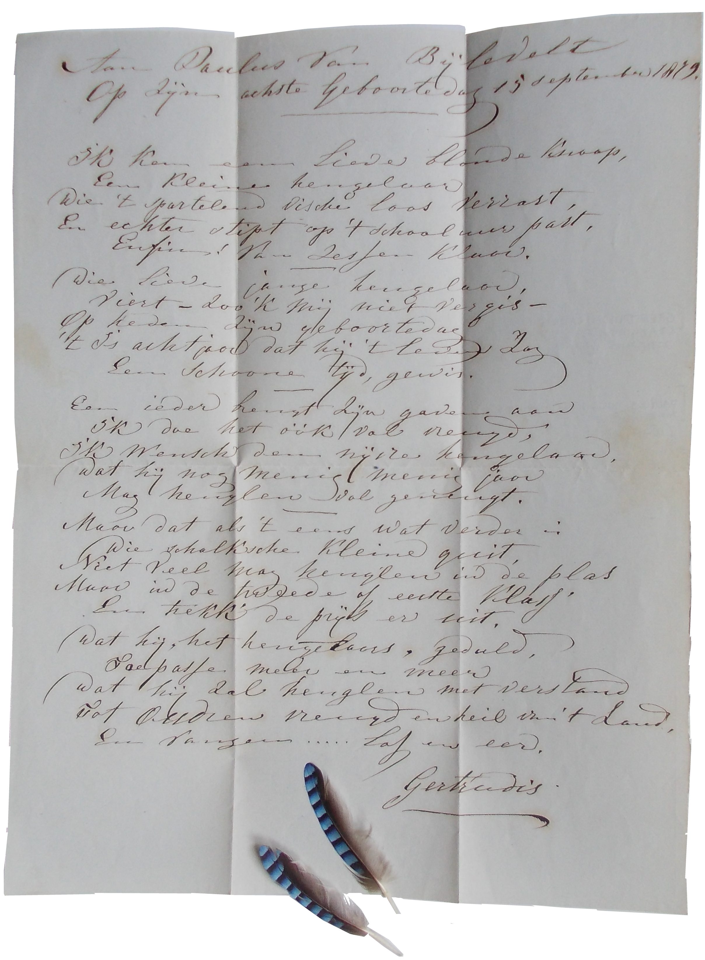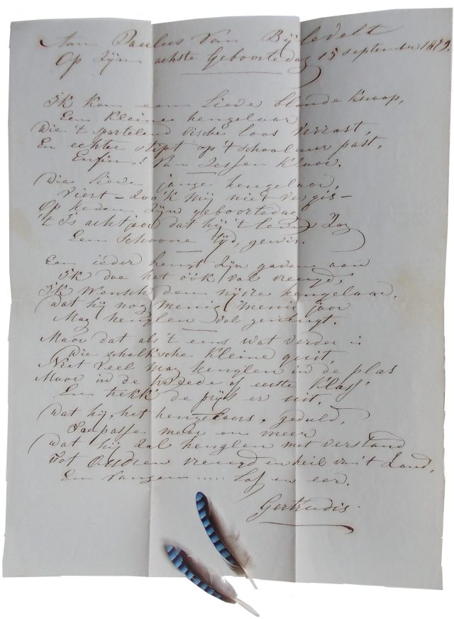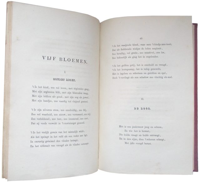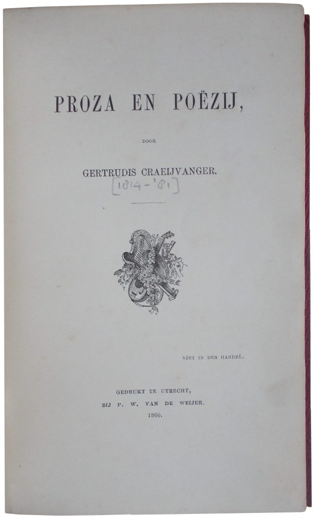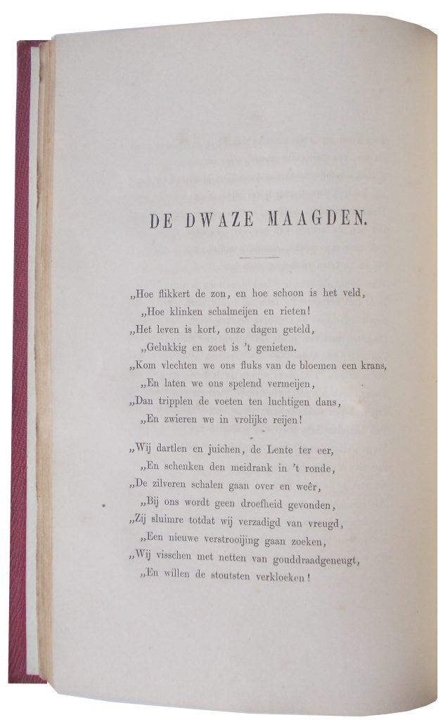 In 1873 verkast Berthe opnieuw, ditmaal definitief, naar Selipi, een gehucht in het landelijke gebied ten zuidwesten van Batavia. Haar tweede dochter Julia Bertha, die net als Maria Philippina zo’n grote steun was geweest op de meisjesschool in de Gang Scott, zal al in 1874 op jonge leeftijd komen te overlijden. Dit is voor Berthe (minstens zo gekweld als getroost door haar godsgeloof) aanleiding om een aangrijpende zedenschets en bijpassend stichtelijk treurgedicht te schrijven. Beide worden in 1876 onder het pseudoniem ‘B.’ te ‘Java’ gepubliceerd in het Evangelisch Jaarboekje Magdalena (afb. 13).41 De baten van deze protestantse almanak kwamen overigens ten goede aan de Vereeniging het Asyl Steenbeek te Amsterdam, een tehuis dat was opgezet ter ‘opbeuring’ van ‘boetvaardige’ en tot ‘christelijke inkeer’ gekomen ‘gevallen vrouwen’,42 dat wil zeggen, ex-prostituees, zoals, volgens kwade roomse tongen, Jezus’ eigen echtgenote, Maria Magdalena, moet zijn geweest.