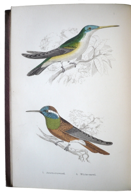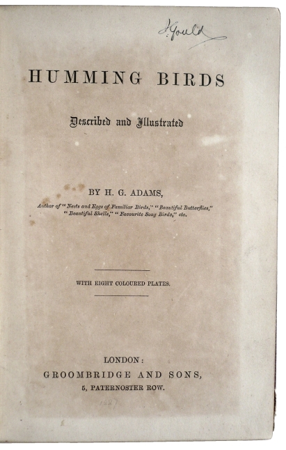 Een auteur wiens werk wél in brede kring kon worden gekocht en gelezen, was Henry Gardiner Adams (1811-’81). In 1856 publiceerde hij een bescheiden boekje eveneens over kolibries, geïllustreerd met 8 prachtige handgekleurde lithografieën (zie afbeeldingen). Het boekje, getiteld Humming Birds Described and Illustrated, werd al vrij snel populair. Er verschenen verschillende herdrukken. John Gould, die goed bevriend was met Adams, schreef in 1856 in een van zijn brieven dat hij bijzonder van het boekje gecharmeerd was en het regelmatig aan vrienden, kennissen en jonge vogelliefhebbers cadeau deed. Uit de mond van zo’n beroemde ornitholoog was dit uiteraard een groot compliment. Dat Gould een exemplaar van het boekje daadwerkelijk in zijn bezit had blijkt uit onderstaande afbeelding: het hierop afgebeelde unieke exemplaar bevat de namelijk de handtekening van hemzelf, en is kennelijk afkomstig uit zijn eigen bibliotheek.