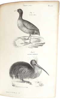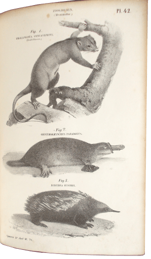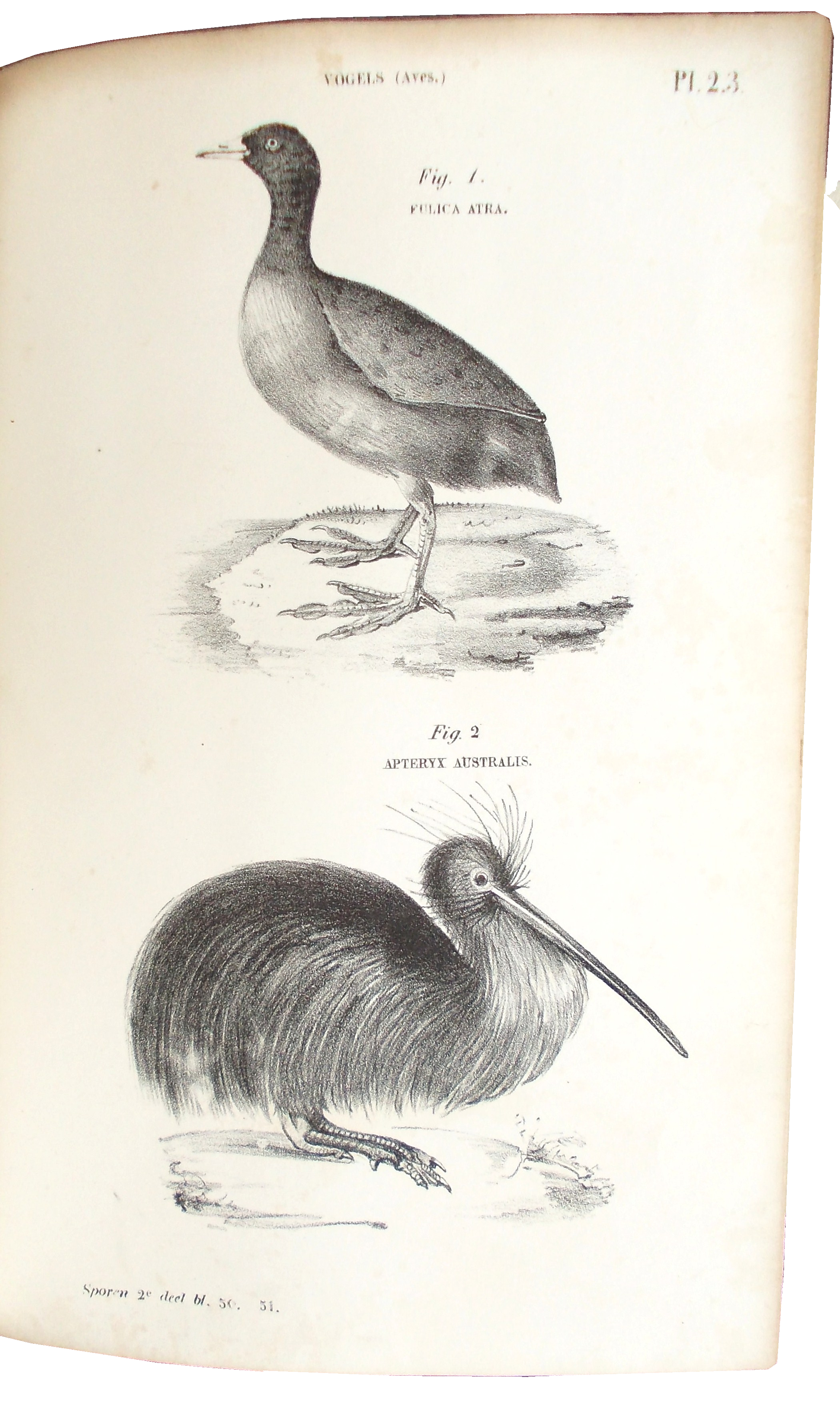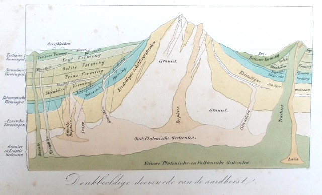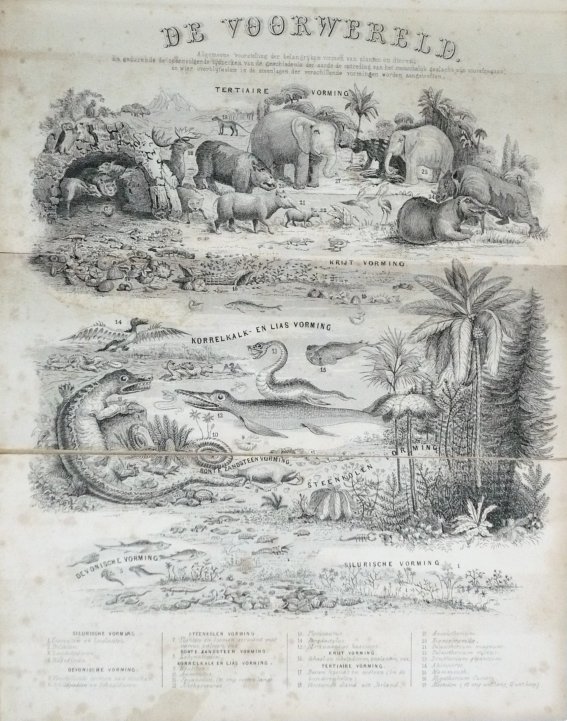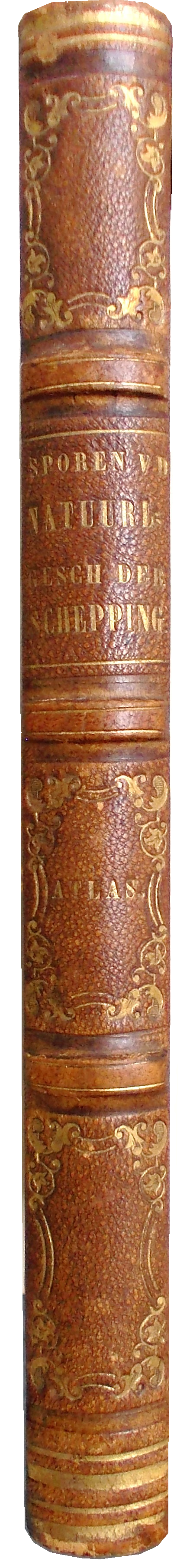 Ten tijde van de Nederlandse vertaling was de naam van de schrijver nog altijd niet bekend, dus ook de vertaling en de atlas verschenen anoniem. De laatste werd in 1850-’51 gepubliceerd in twee delen (bij het hiernaast afgebeelde exemplaar zijn deze samengebonden in één lederen band), en was voorzien van tientallen opvallend fijnzinnig gelithografeerde afbeeldingen van vogels, zoogdieren, reptielen, amfibieën en vooral, heel onchristelijk, uitgestorven dieren. Op een fraaie uitklapplaat is bovendien chronologisch de geschiedenis van de levende natuur vastgelegd, daarmee onweerlegbaar (en misschien wel voor het eerst in de Nederlandse wetenschaps-geschiedenis) daadwerkelijke evolutionaire verwantschappen suggererend.