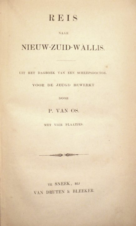 De uitgever van het boekje, Van Druten & Bleeker te Sneek, gaf tussen 1852 en 1857 een driedelige reeks uit getiteld ‘Keur der nieuwste en belangrijkste reisbeschrijvingen’. Als eerste in de serie verscheen Reizen der Engelschen ter ontdekking ener Noordwestelijke doorvaart door den Noordelijke IJszee naar den Stillen Oceaan, in 1853 gevolgd door Reis naar de kolonie van misdadigers Nieuw-Zuid-Wallis. Uit het dagboek van een scheepsdoctor. Voor de jeugd bewerkt door P. van Os. Met vier plaatjes., waarvan de onderhavige editie mogelijk een gewijzigde herdruk of een titeluitgave is. Als laatste deeltje verscheen in 1852 en 1857 de tweedelige Reizen der Engelschen naar de noordelijke Ijszee en de Stillen Oceaan. De hier besproken titel dus twee keer uitgegeven, de laatste keer licht gewijzigd.
