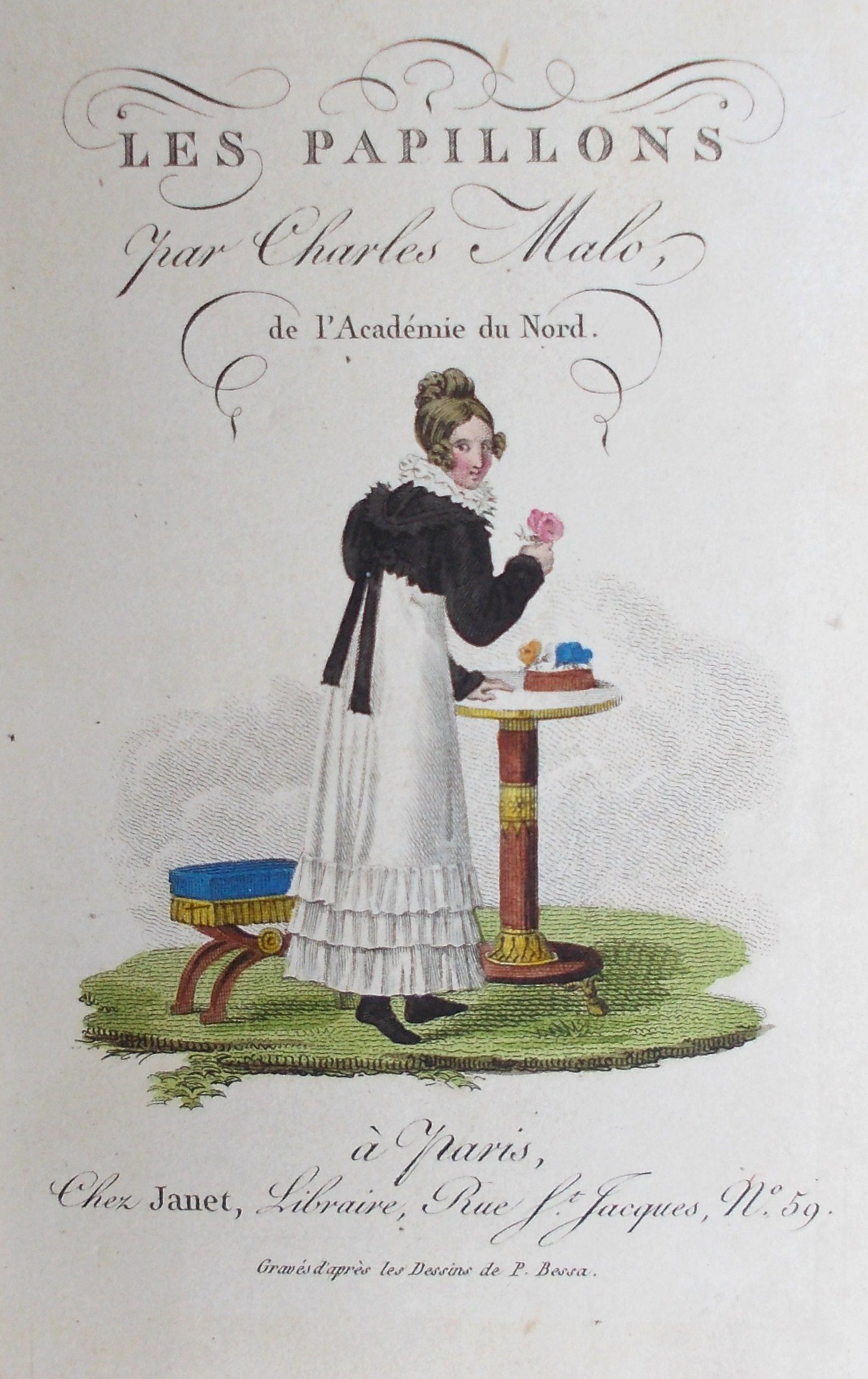 Eén van die salonboekjes is Malo’s Les Papillons, uitgegeven rond 1816 bij Janet, Libraire, Rue St. Jacques No. 59, Paris, en gedrukt bij L’Imprimerie de Richomme, eveneens in de Rue Saint-Jacques, No 67. Het originele bandje is van zachtroze karton, in een handzaam kartonnen foedraaltje gestoken met dezelfde zuurstokroze tint. De gegraveerde titelprent verraadt waar het om gaat: een wat schalks ogende dame leunt bevallig tegen een modieus 19de-eeuws éénpootstafeltje en houdt in één hand zorgvuldig een ondetermineerbaar rozig vlindertje vast. Dat toonde de ware esprit van die tijd: vrouwen uit de hogere kringen werden geacht zich bezig te houden met onschuldige zaken als natuurstudie, pianospelen of kunst , maar zodra zich (hopelijk) het huwelijk aandiende, was het gedaan met al die feminiene fratsen.