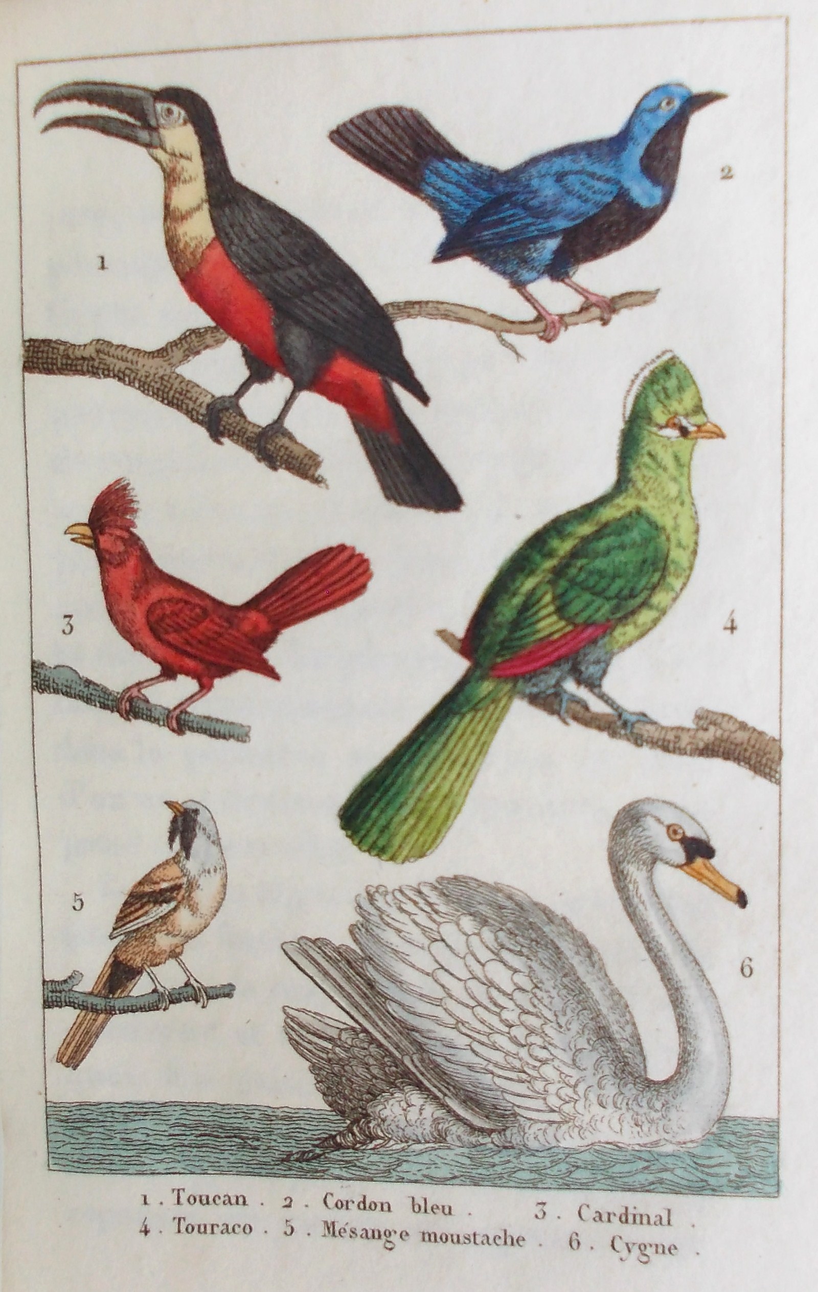 Een andere titel in hetzelfde genre is het anoniem uitgegeven Histoire Naturelle en Miniature Suite à l’Abeille des Dames (ca 1820), uitgegeven bij Le Fuel, Libraire, Rue St. Jacques, No. 54, Paris (blijkbaar vlakbij de uitgever van het boekje van Charles Malo). Ook dit tweede boekje heeft een verleidelijk glimmend roze bandje, gestoken in een beschermende kartonnen cassette, met eveneens een gegraveerde titelprent en elf met de (kinder)hand ingekleurde gravures, niet alleen van vlinders maar ook van exotische vogels en fijnzinnige bloemetjes en plantjes.