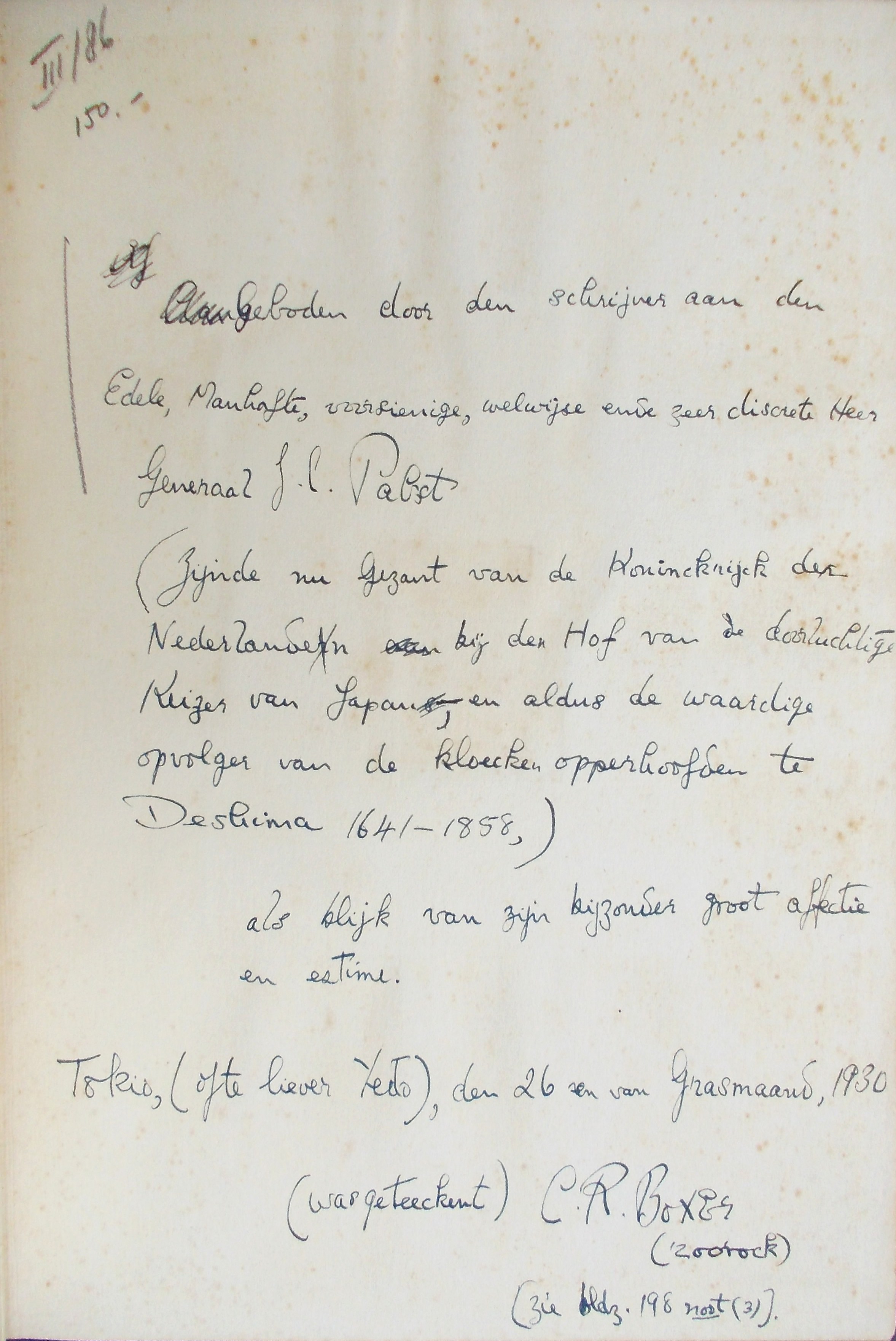 Geboden door den schrijver aan den Edele, Manhafte, voorzienige, welwijze ende zeer discrete Heer Generaal J.C. Pabst (Zijnde nu Gezant van de Koninckrijck der Nederlanden bij den Hof van de doorluchtige Keizer van Japan, en aldus de waardige opvolger van de kloecken opperhoofden te Deshima (1641-1858,) als blijk van zijn bijzonder groot affectie en estime. Tokio, (ofte liever Yedo), den 26en van Grasmaand [= april], 1930 (was geteeckent) C.R. Boxer (roorock [= roodjas]) (zie bldz. 198 noot (3)).