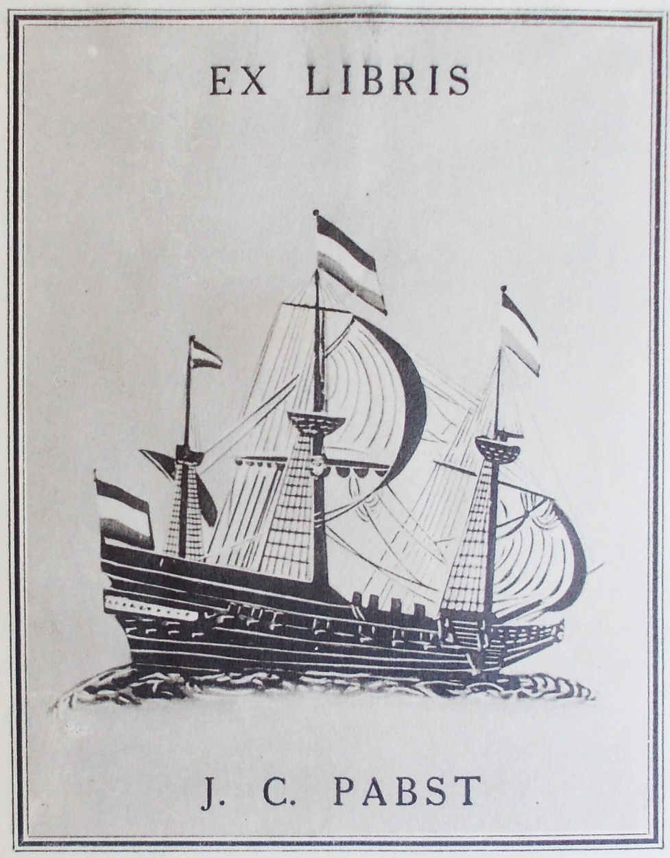 Blijkbaar hield Boxer van archaïserende taalgrapjes, want enkele jaren later deed hij iets soortgelijks als voor zijn vriend Pabst. Hij reisde toen samen met hem rond in het toenmalige Nederlands-Indië, met in hun bezit een zelfverzonnen, handgeschreven document dat was opgesteld door enkele Nederlandse vrienden in dezelfde plechtstatige VOC-stijl. De vrienden waren de historici J.C.M. Warnsinck, J.W. van Nouhuys, S.P. L’Honoré Naber, W. Voorbeytel Cannenburg, A. Engelbrecht, R. Bijlsma en de uitgever en antiquaar Wouter Nijhoff. Deze laatste had het unieke document laten vervaardigen. In de ‘gewichtige’ tekst wordt de Indische autoriteiten verzocht medewerking te verlenen aan de enthousiaste ‘dienaren’ Boxer en Pabst, en hun te assisteren bij allerlei belangrijke werkzaamheden voor de Loffelijke Compagnie (zoals de VOC toen werd genoemd). In 1930 plakt Boxer zijn eigen fraaie blauwlederen exlibris (afgebeeld bovenaan dit artikel) op het eerste schutblad van zijn Tromp-boek. Als Pabst dit cadeau krijgt plakt hij er ook zijn eigen papieren exlibris in, één bladzijde verder, op de zogenaamde Franse pagina (hiernaast afgebeeld). Het is dit bijzondere dubbele-provenance-exemplaar dat in 2010 op de najaarsveiling van Bubb Kuyper in Haarlem werd aangekocht voor de bibliotheek van het Magazijn van Natuurlijke Historie. Daar staat het nu te midden van zo’n 1500 [inmiddels bijna 2000] andere titels over de roemruchte Europees-Japanse betrekkingen in de Edo-periode.