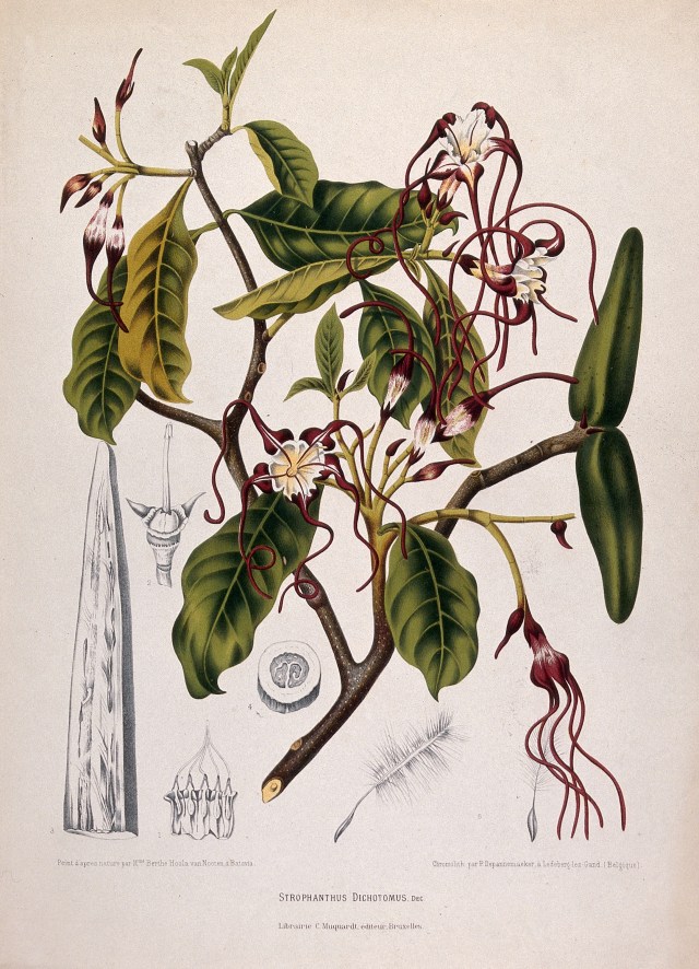 De schoonheid van de touwbloem is overigens bedrieglijk: de plant bevat een krachtig gif (strophantine) dat vroeger door Maleise ‘inboorlingen’ voor dodelijke pijlpunten werd gebruikt. Hoewel de originele aquarel ervan verloren lijkt gegaan, werd deze ooit door de Brusselse lithograaf Guillaume Severeyns in ‘kostelijke’ kleuren en natuurgetrouw op watermerkloos velijnpapier gereproduceerd, om zo, samen met alle andere gedrukte platen, tekstbladen en titelpagina, alsnog vereeuwigd te worden in Fleurs, fruits et feuillages choisis de la flore et de la pomone de L’Ile de Java, het botanische prachtwerk van een in meerdere opzichten ongekende negentiende-eeuwse vrouw.