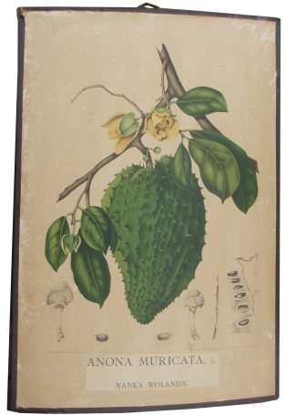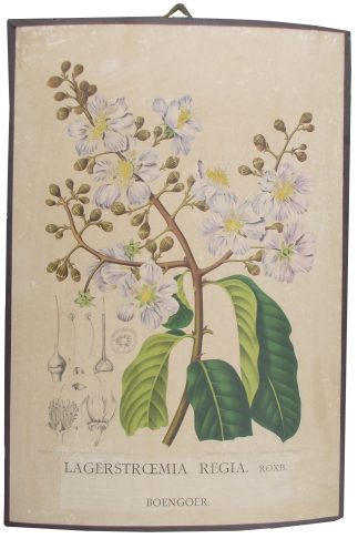 Op de schoolplaten zijn vier op Java geliefde plantensoorten te zien: ‘Amherstia Nobilis’ (tegenwoordig Amherstia nobilis, plaat 2 uit het florilegium) uit Birma, ‘Saraca Declinata’ (Saraca thaipingensis, plaat 10) uit Thailand, de inheemse ‘Lagerstrœmia Regia’ (Lagerstroemia reginae, syn. L. speciosa, plaat 22) en de uit Midden-Amerika afkomstige ‘Anona Muricata’ (zuurzak, Annona muricata, plaat 39). Iedereen die zo gelukkig is het originele boek te mogen doorbladeren zal al snel kunnen zien dat deze minder zijn uitgekozen om hun wetenschappelijke relevantie dan om hun spectaculaire uiterlijk. De omvangrijke platen (chromolithografieën, steendrukken in kleur) zijn rondom afgesneden om ze op steviger, lilakleurige kartonnen vellen (55 x 37,5 cm) te kunnen plakken, omrand door zwartgeverfd linnen. De oorspronkelijke ondertitels, met Latijnse en soms ook inheemse plantennamen, zijn uitvergroot, losgeknipt en op de bladen bevestigd, terwijl de vier bijbehorende Franse teksten (alle edities van het boek bevatten ook Engelse) eveneens zijn uitgeknipt, en op de achterkant vastgelijmd. Een donkergeel lintje zorgt ervoor dat de platen opgehangen en zodoende op ooghoogte bestudeerd kunnen worden. De hele constructie lijkt minstens een eeuw oud te zijn.