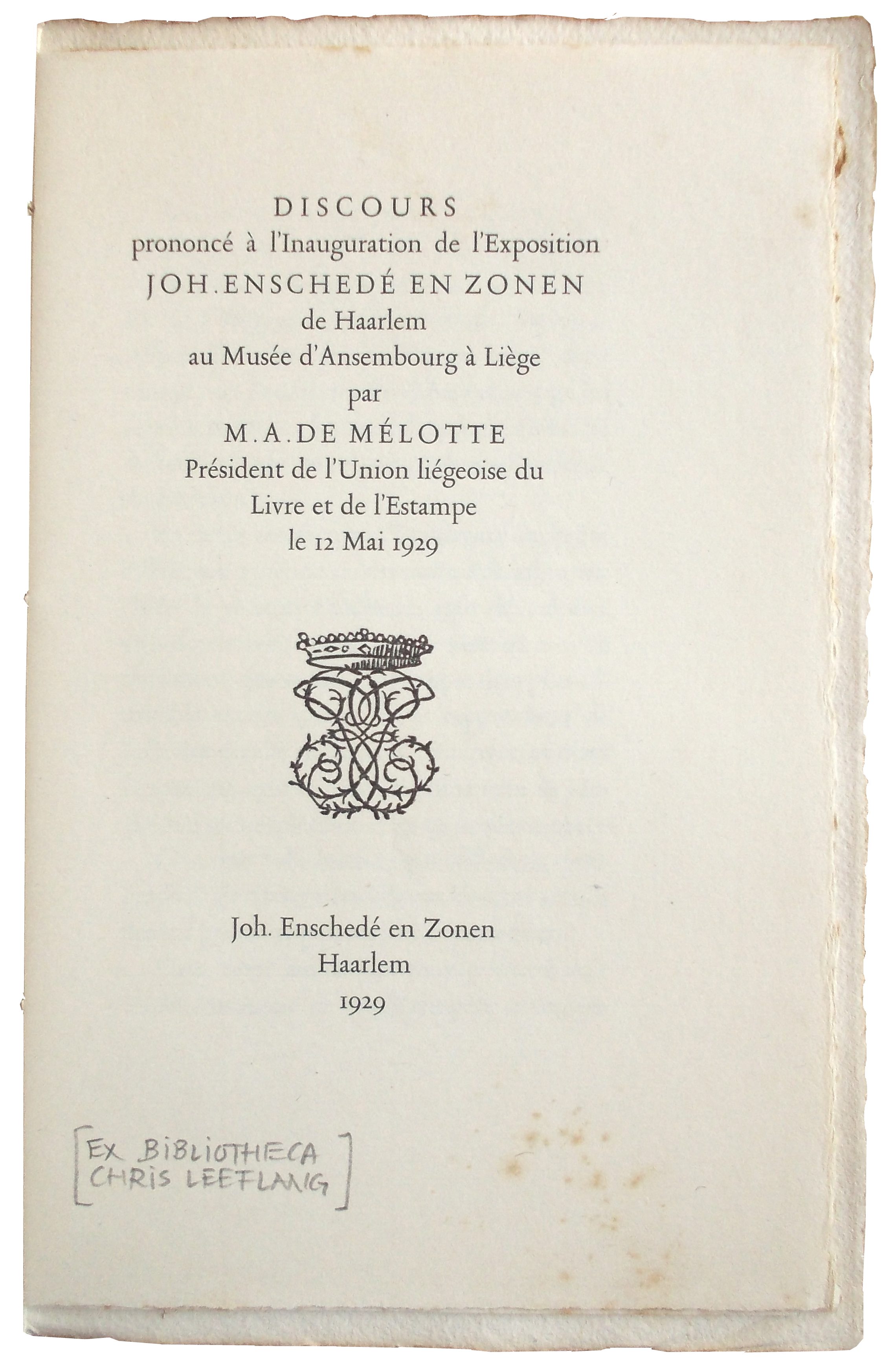 Discours prononcé à la L’Inauguration de l’Exposition Joh. Enschedé en Zonen de Haarlem au Musée d’Ansembourg à Liège (zie afbeelding rechts). De tekst was niet alleen geschreven, maar eerder ook uitgesproken door De Mélotte, de al genoemde oprichter van het Luikse bibliofielengenootschap. Kennelijk waren Van Krimpens sociale vaardigheden toen al berucht: op de opening van de tentoonstelling scheen hij zich wegens een door De Mélotte nogal ironisch verwoord ‘sentiment exageré de délicatesse’ verhinderd gevoeld te hebben zelf te komen praten. Ondanks dit soort kittelorig gedrag zullen Van Krimpens Luikse contacten ervoor gezorgd hebben dat hij in het jaar daarop bij Enschedé de prestigieuze Poèmes kon vormgeven.
