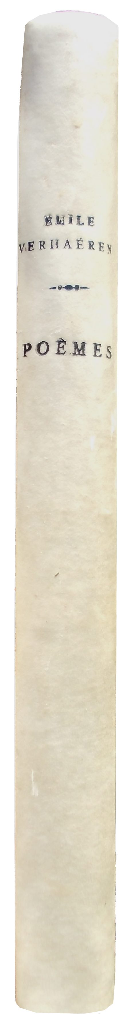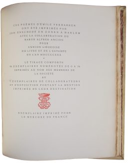 Volgens het colofon (zie afbeelding hieronder) is het exemplaar bedoeld voor Le Mercure de France, de Parijse uitgever van het gelijknamige literatuurtijdschrift. De eigenaar ervan, Alfred Vallette, was niet alleen een jeugdvriend van Verhaeren geweest, maar tevens de belangrijkste bezorger van diens werken. Deze jarenlange band met de dichter en zijn werk verklaart dan ook waarom Vallette zich in 1930 intensief bemoeide met de postume publicatie van diens Poèmes, met als dank dit door hemzelf daarom verzochte exemplaar. Uitgegeven in Luik, gedrukt in Haarlem: dat klinkt onpraktisch, maar in de laatste stad bevond zich destijds de firma Joh. Enschedé en Zonen, wereldvermaard om haar klassiek verzorgde drukwerk.