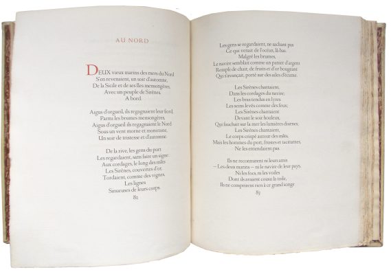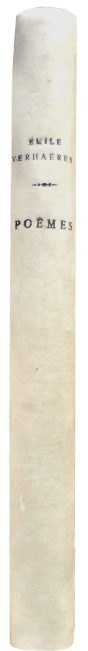 Alles bij elkaar moet de uitgave een prijzige aangelegenheid zijn geweest. Alleen al aan auteursrechten betaalde de Union ff 2400,- aan de weduwe van Verhaeren, zo’n anderhalfduizend euro. Maar echte bibliofielen laten zich niet kennen: als om de futiliteit van dat soort pecuniaire verplichtingen onverbloemd te laten, of zelfs te benadrukken, zijn twintig van de eerste en laatste pagina’s van de kostbare vellen Barcham Green-papier geheel onbedrukt gebleven. Een zee van maagdelijk wit is het resultaat. Ware bibliofilie kun je zelfs horen: bij het voorzichtig omslaan ervan ruisen de ongerepte bladen… Volgens Jan van der Marck, de bekende, in 2010 overleden verzamelaar van typografische rariora, was de 1930-Poèmes dan ook een van de ‘favourite’ titels uit zijn toch al rijke collectie. Maar het kan nòg bibliofielerer, zoals Alice gezegd zou hebben: in het Noord-Hollands Archief te Haarlem wordt een exemplaar van Poèmes bewaard dat weliswaar ongenummerd is en dus tot de kleinste oplage behoort, maar toch in de eenvoudige papieren omslag is gestoken, wat betekent dat mijn eigen, ooit voor Le Mercure de France in perkament gebonden exemplaar daadwerkelijk uniek kan zijn.