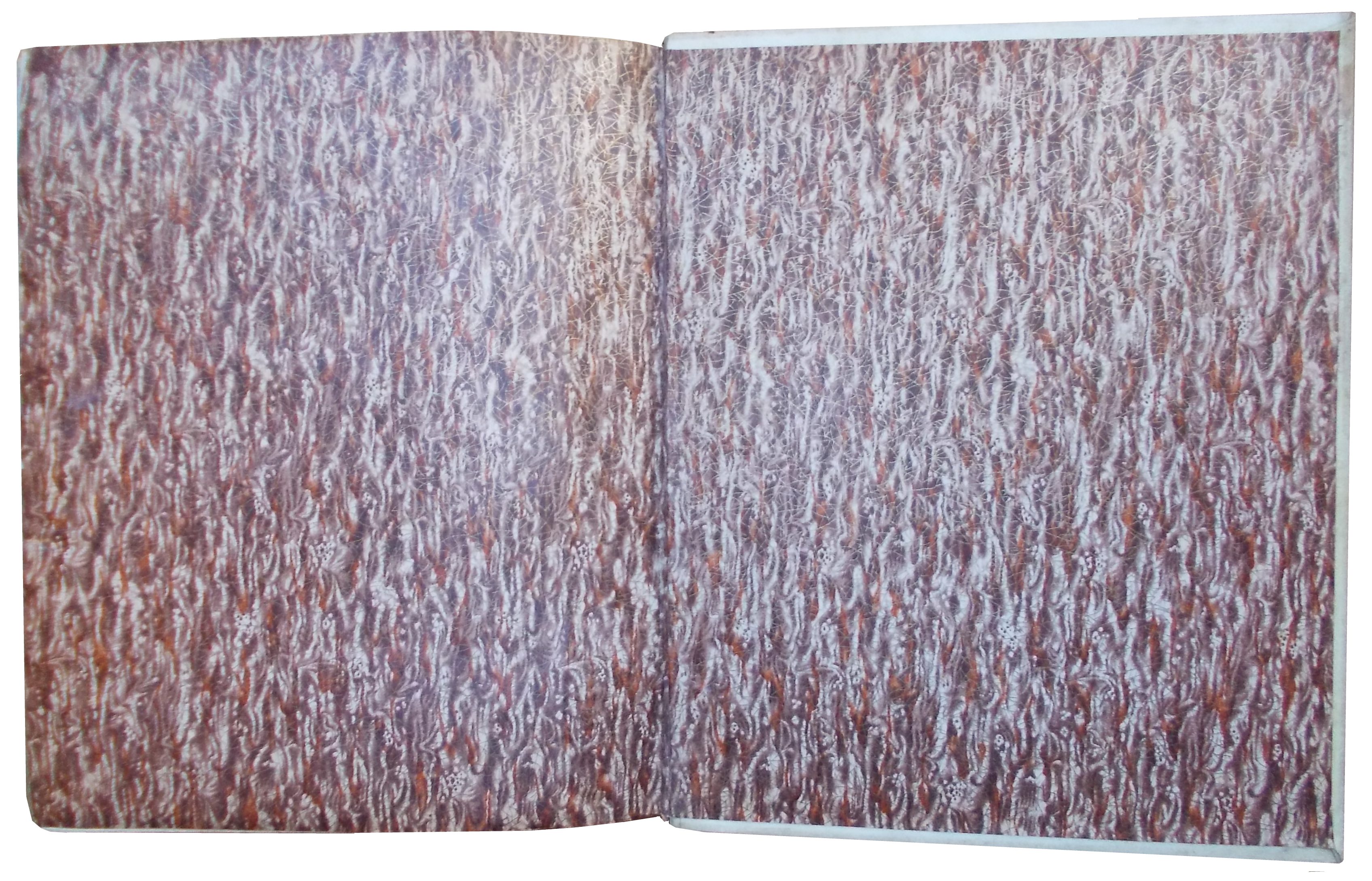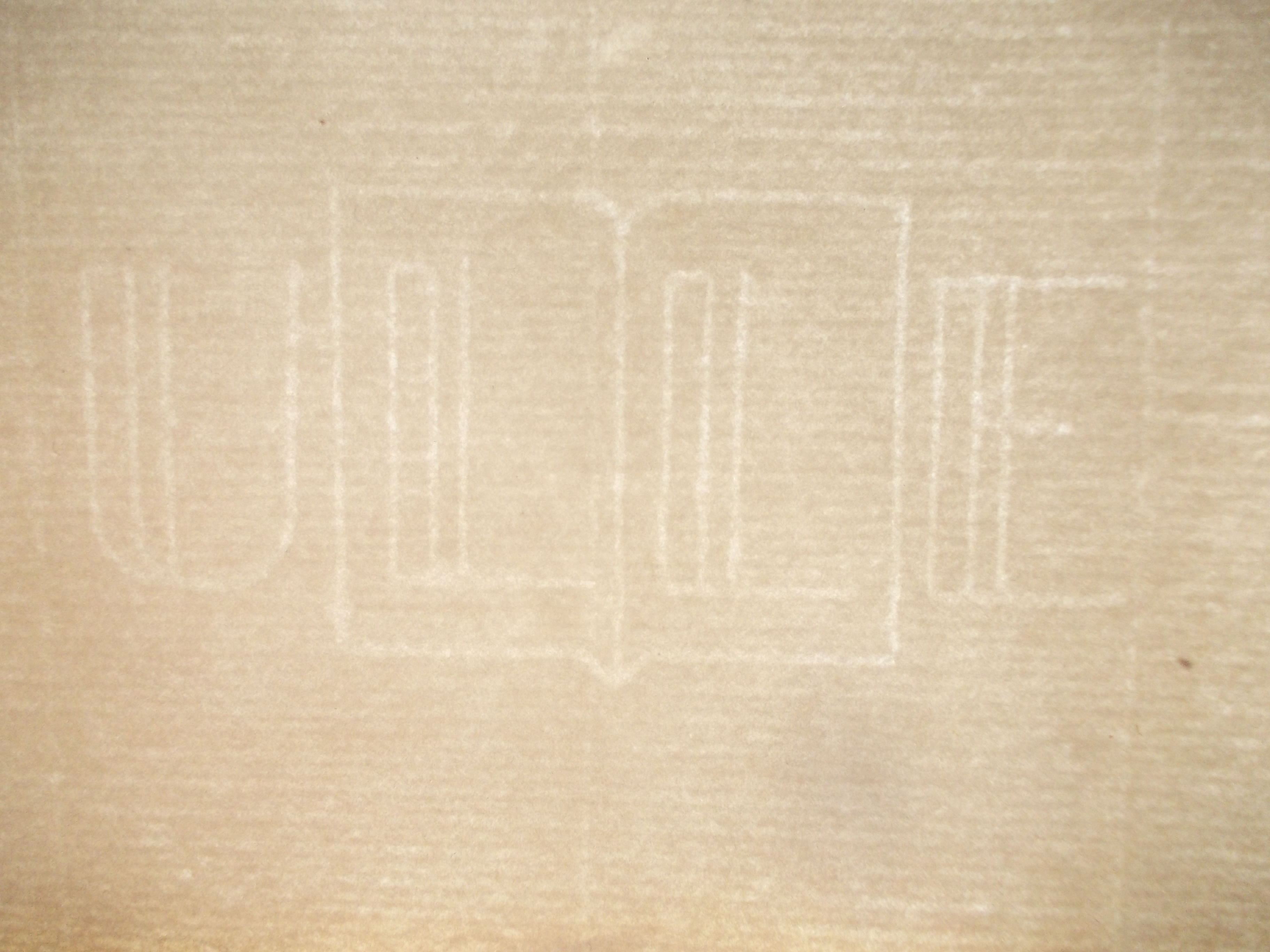 Eén van de twee watermerken bevat namelijk het strak ontworpen logo van de Union liégeoise du Livre et de l’Estampe, U.L.L.E. (het andere geeft een gestileerde Jezus-kop weer). Het stevige, onafgesneden papier zelf is afkomstig van de beroemde Engelse firma J. Barcham Green. Daarnaast zijn de initialen van alle afzonderlijke gedichten zorgvuldig in druk gerubriceerd (in rood opgemaakt), zoals ooit in middeleeuwse manuscripten door kopiisten met de hand werd gedaan. Op de rug en het voorplat van de forse band (32 x 25 cm) is in zwarte inkt de titel met handstempels gedrukt, iets wat bij een relatief hard en glad materiaal als perkament niet vaak voorkomt (het resultaat is dan ook geen onverdeeld succes, zie afbeelding links).